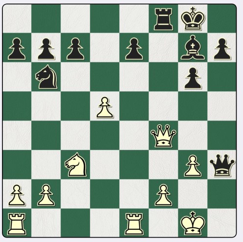 And now 6…Kh6 is the move given in the book, which forces 7 Qe2 with a hopeless position for White. I found 6…Re4+ instead, the main line being 7 Kg5 Rg4+ 8 fg[] Qe4! with a nice final position.